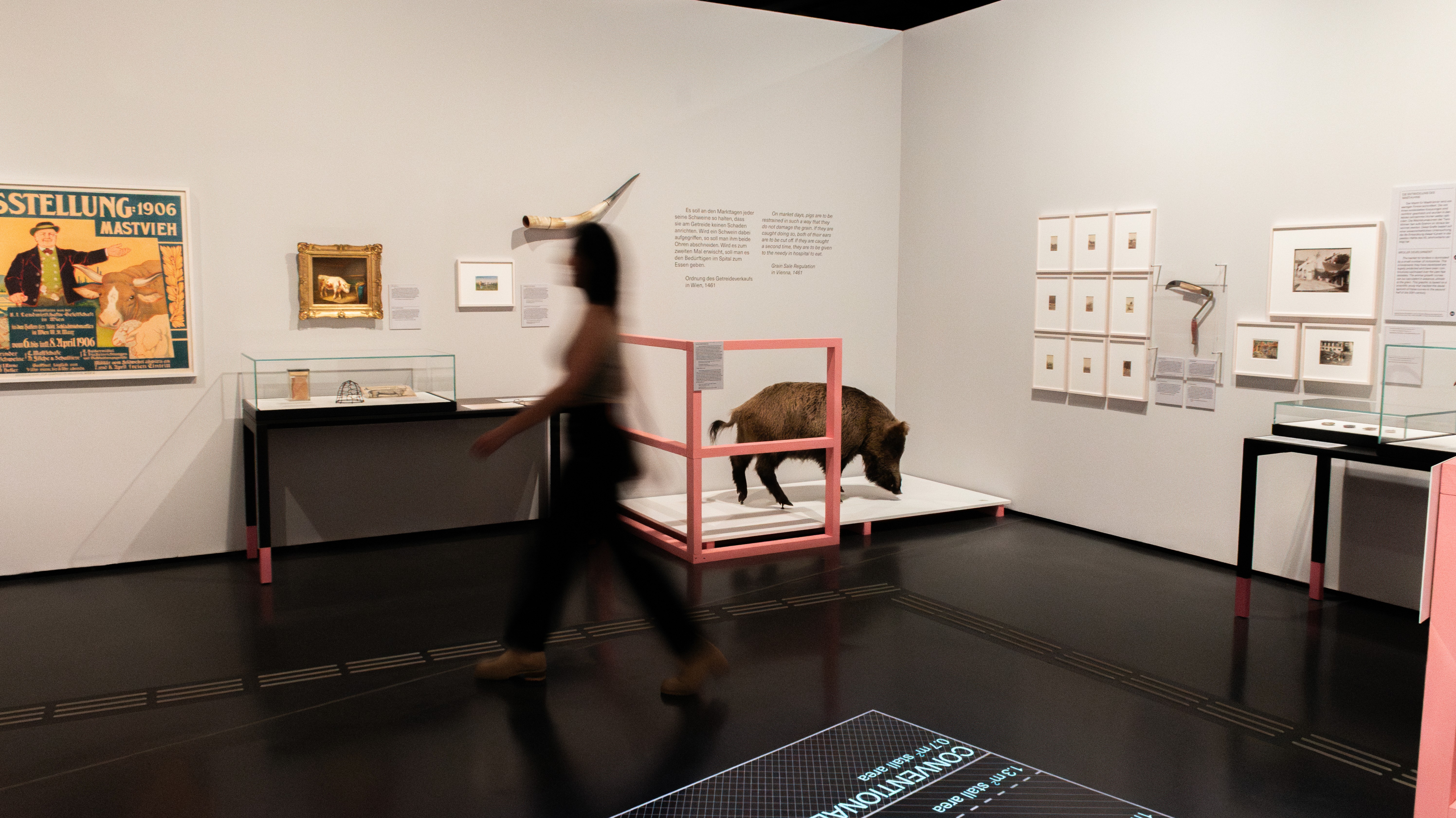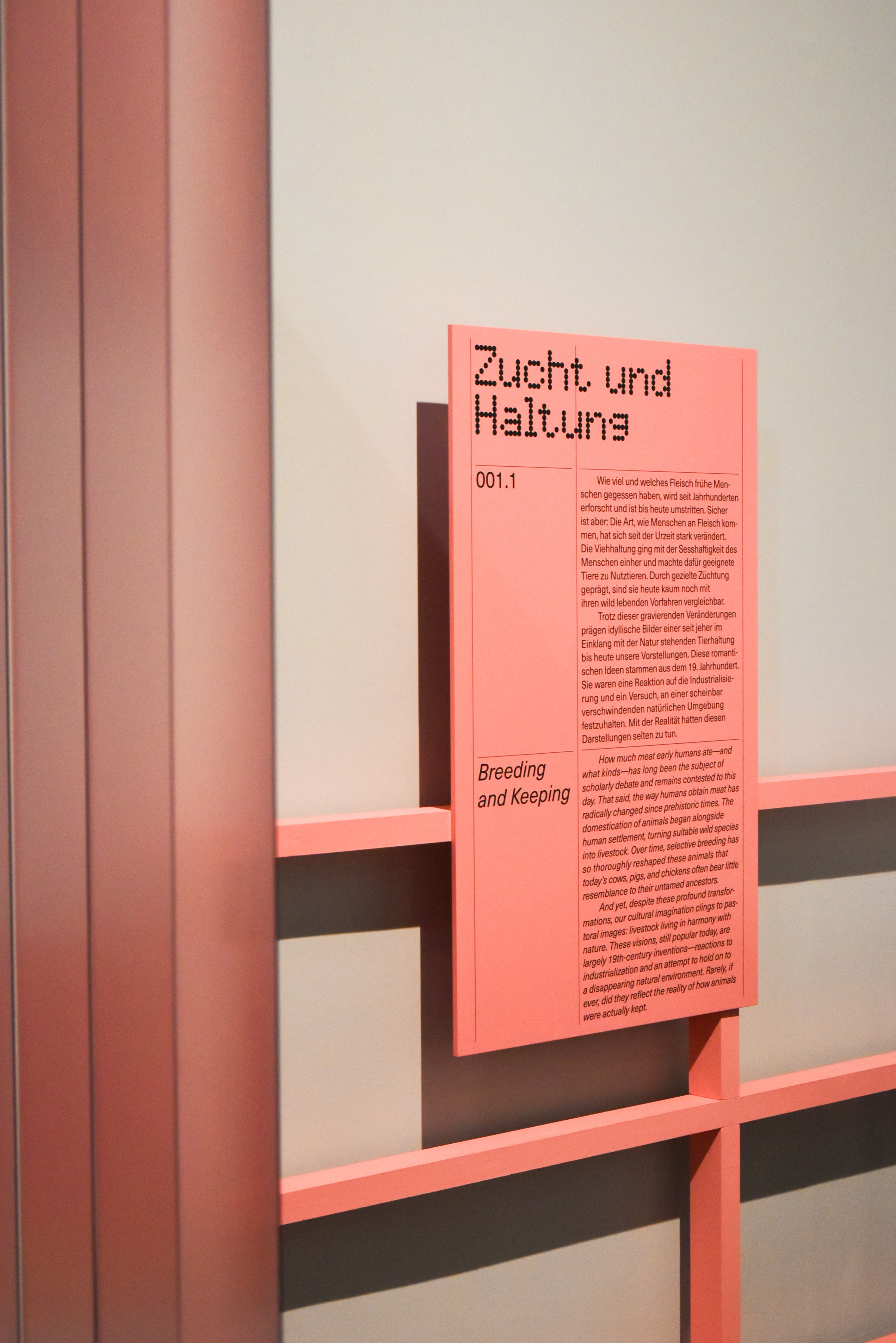 In der Ausstellungsgrafik treffen Körperlichkeit und Technik aufeinander – Textur auf Ordnung, Emotion auf System. Die Gestaltung schafft Räume für Reflexion, setzt gezielte Akzente und lässt die Besucher:innen die komplexe Beziehung zwischen Mensch, Tier und Gesellschaft erleben. Hier verschränkt sich visuelle Klarheit mit inhaltlicher Tiefe und macht die Ausstellung zu einem Ort der Wahrnehmung, des Nachdenkens und des Diskurses.