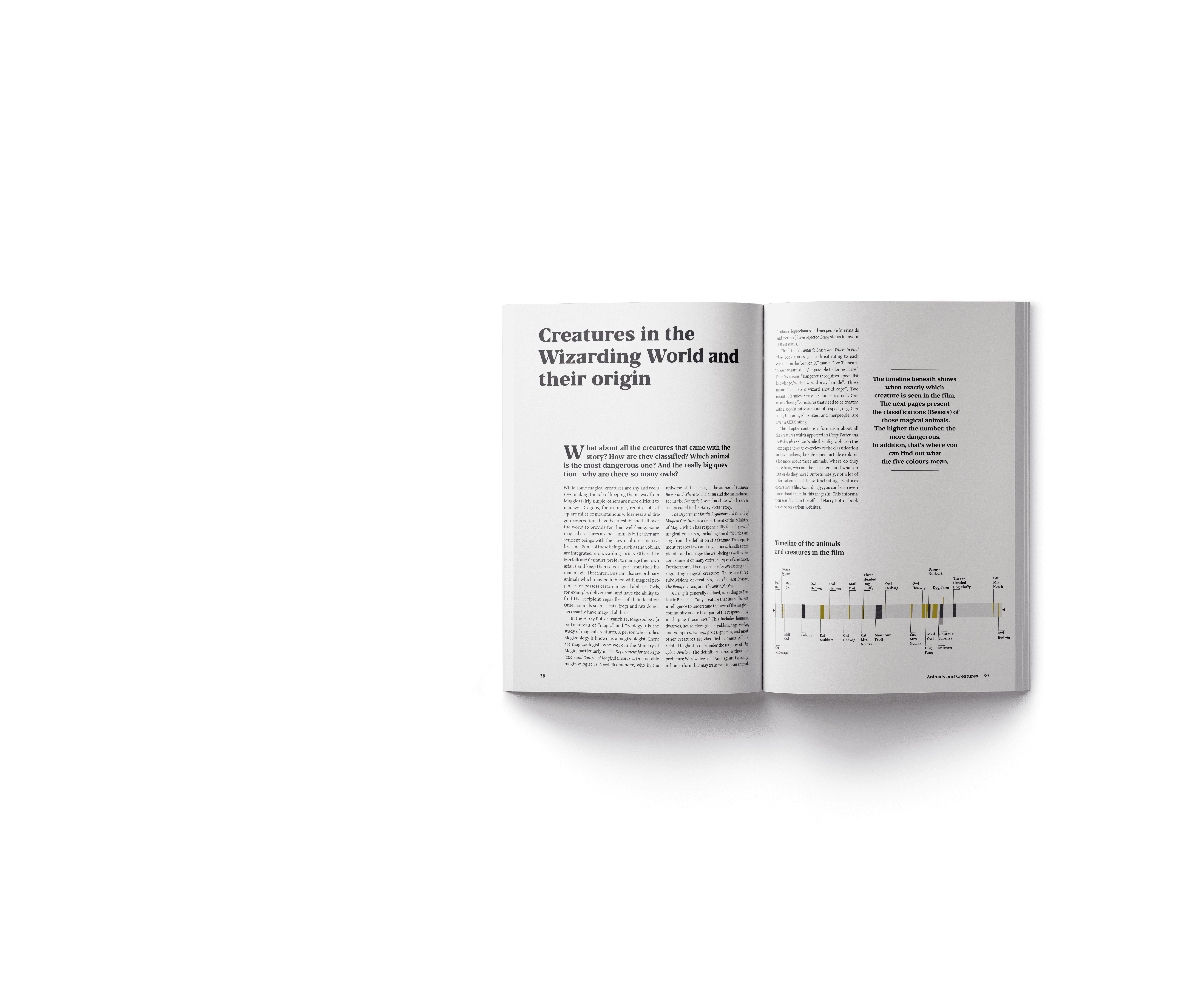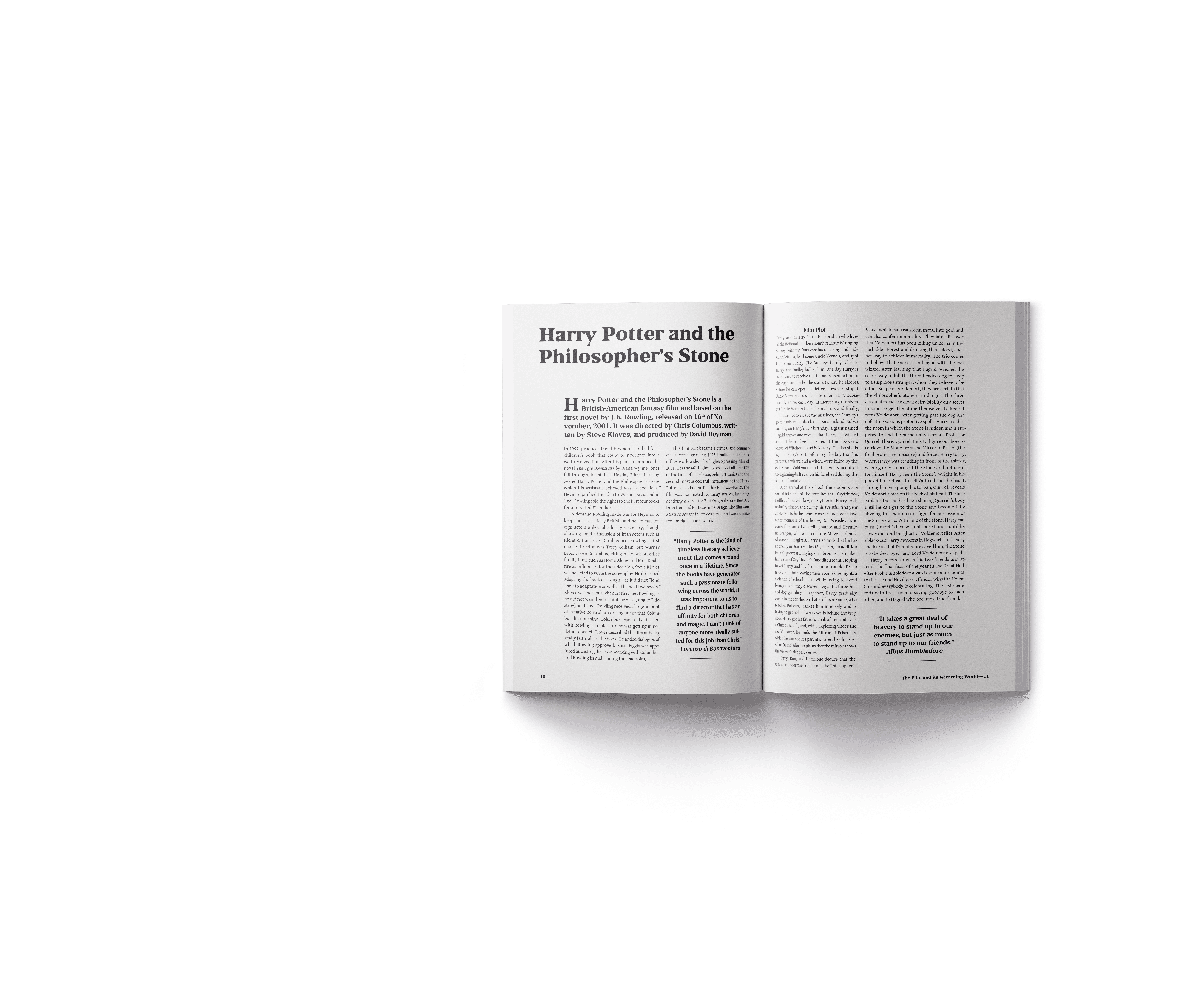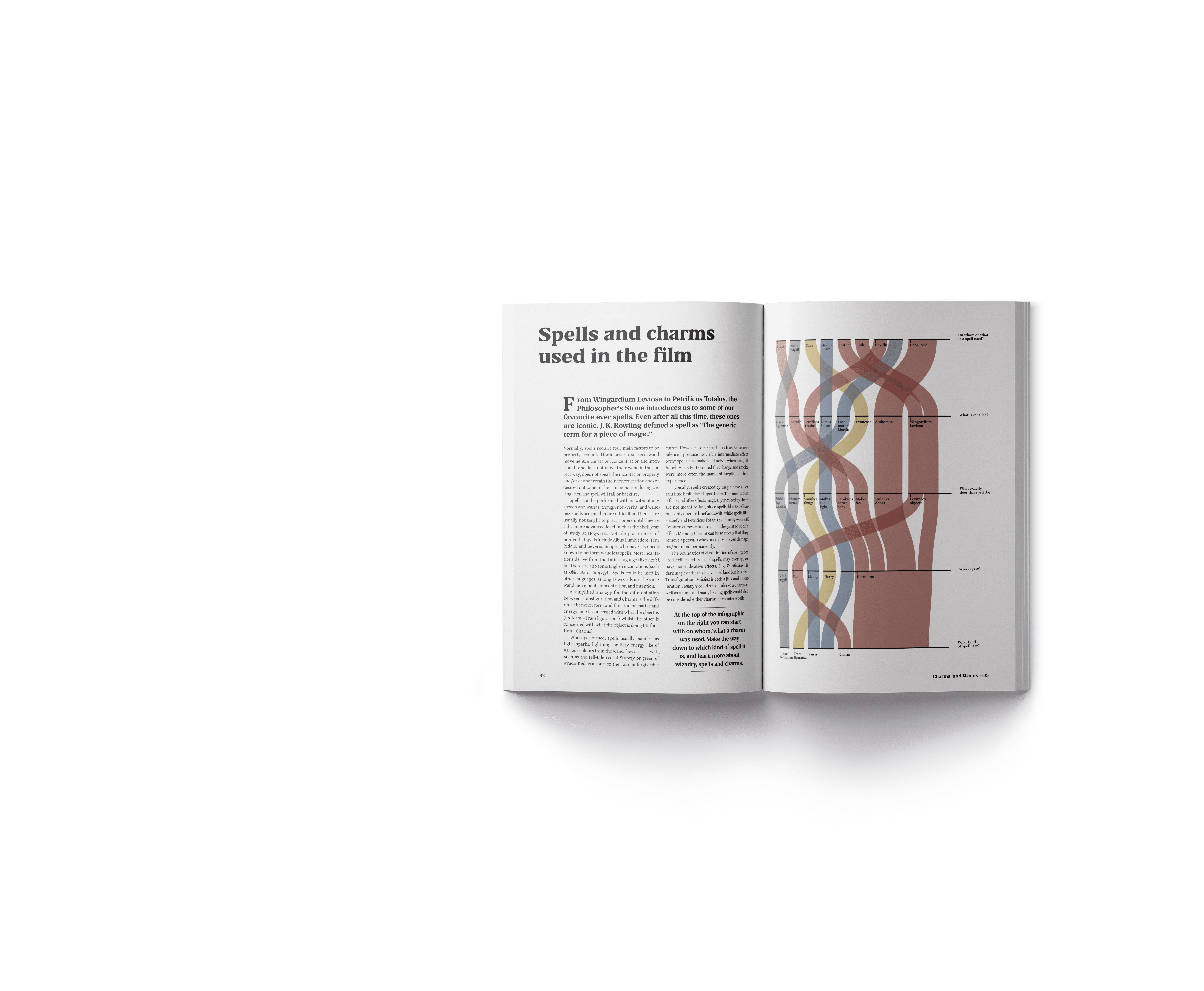 Für eine Filmanalyse wählte ich den ersten Teil der bekannten Harry Potter Filmreihe. Im Laufe der Arbeit erkannte ich meine große Liebe für Infografiken, welche sich auch am Umfang des Magazins wiederspiegelt. Dieses spiegelt den Film wieder, und verschafft zusätzlich einen Einblick in die Komplexität von Harry Potter. Diverse Visualisierungen zu Zauberstäben und -sprüchen, der umfangreichen Kreaturenwelt, sowie auch den Hogwarts Häusern und deren Hauspunkten nehmen die LeserInnen in diese wunderbare Welt voller Zauber mit.