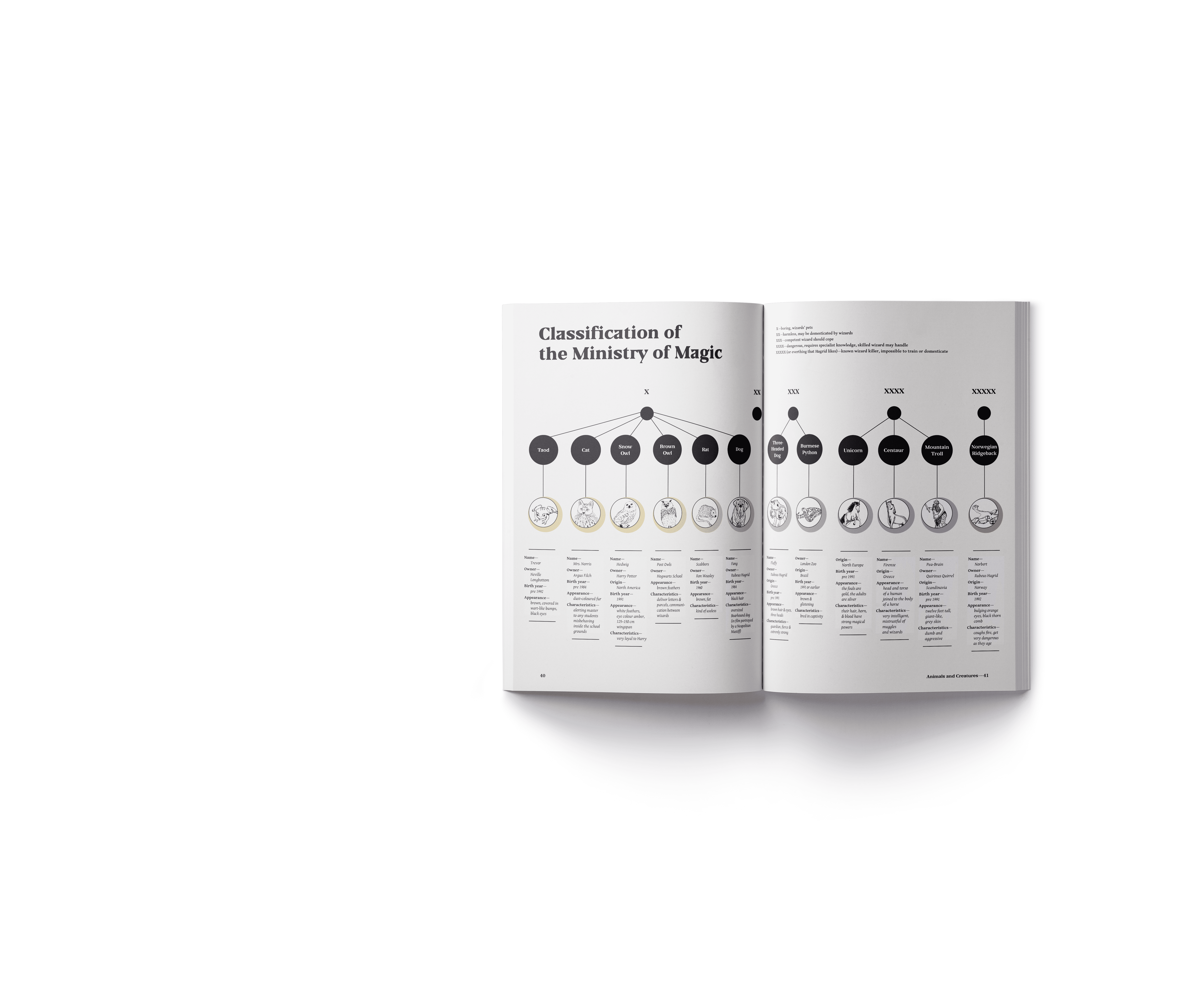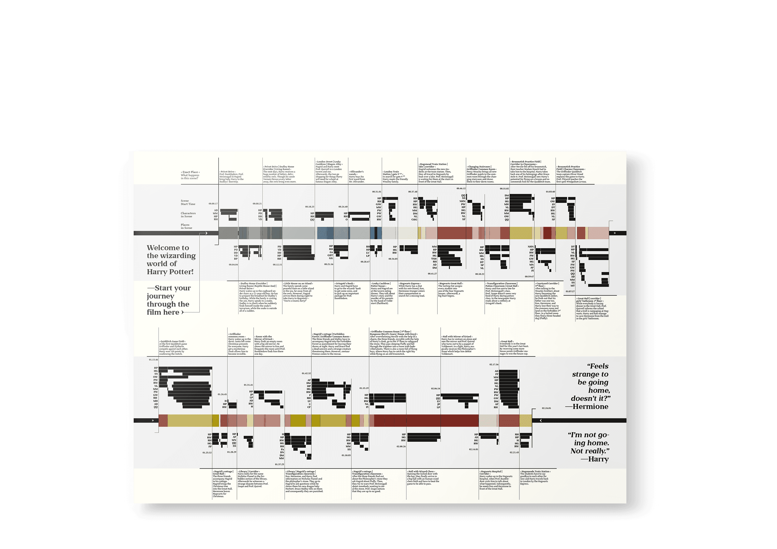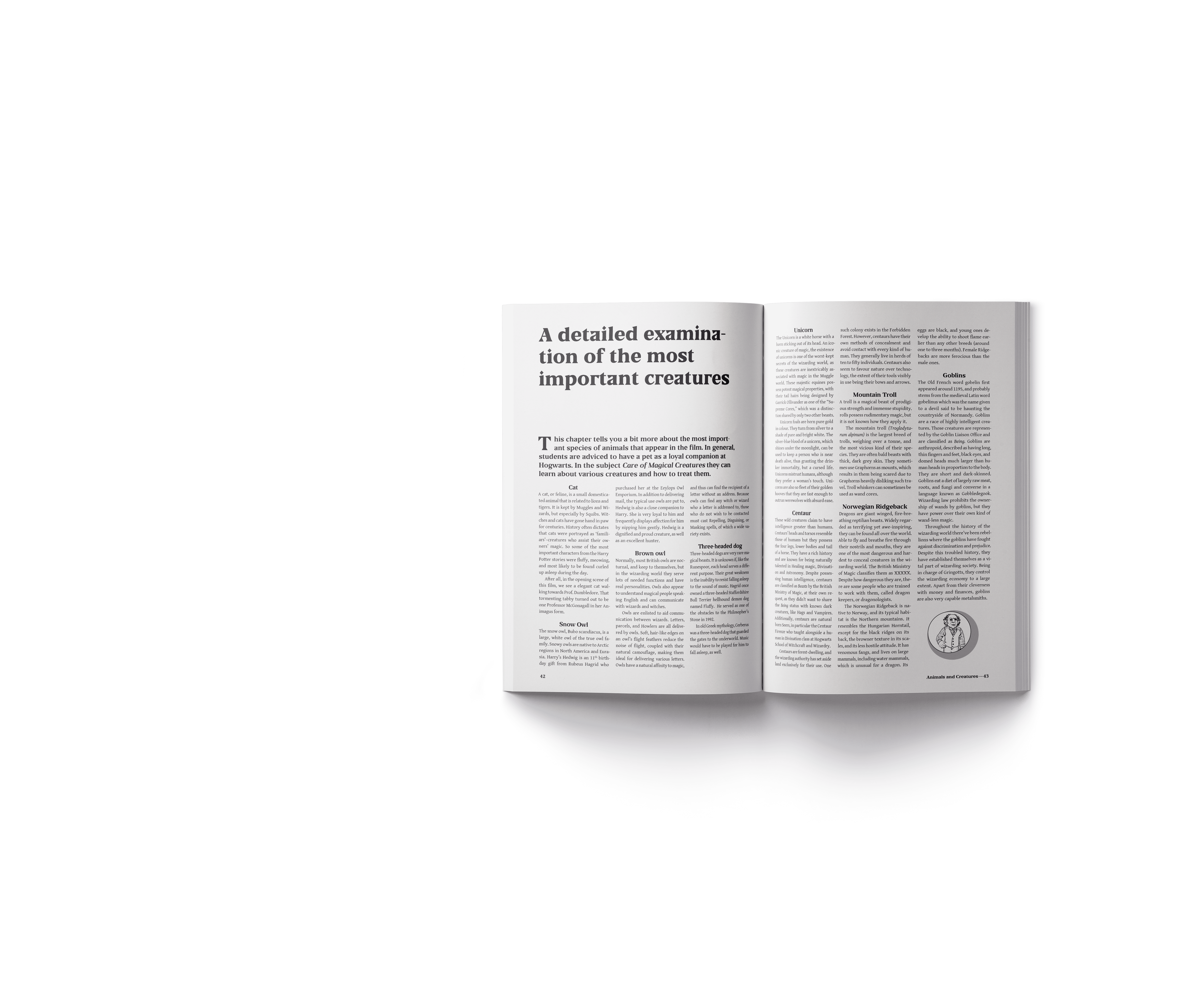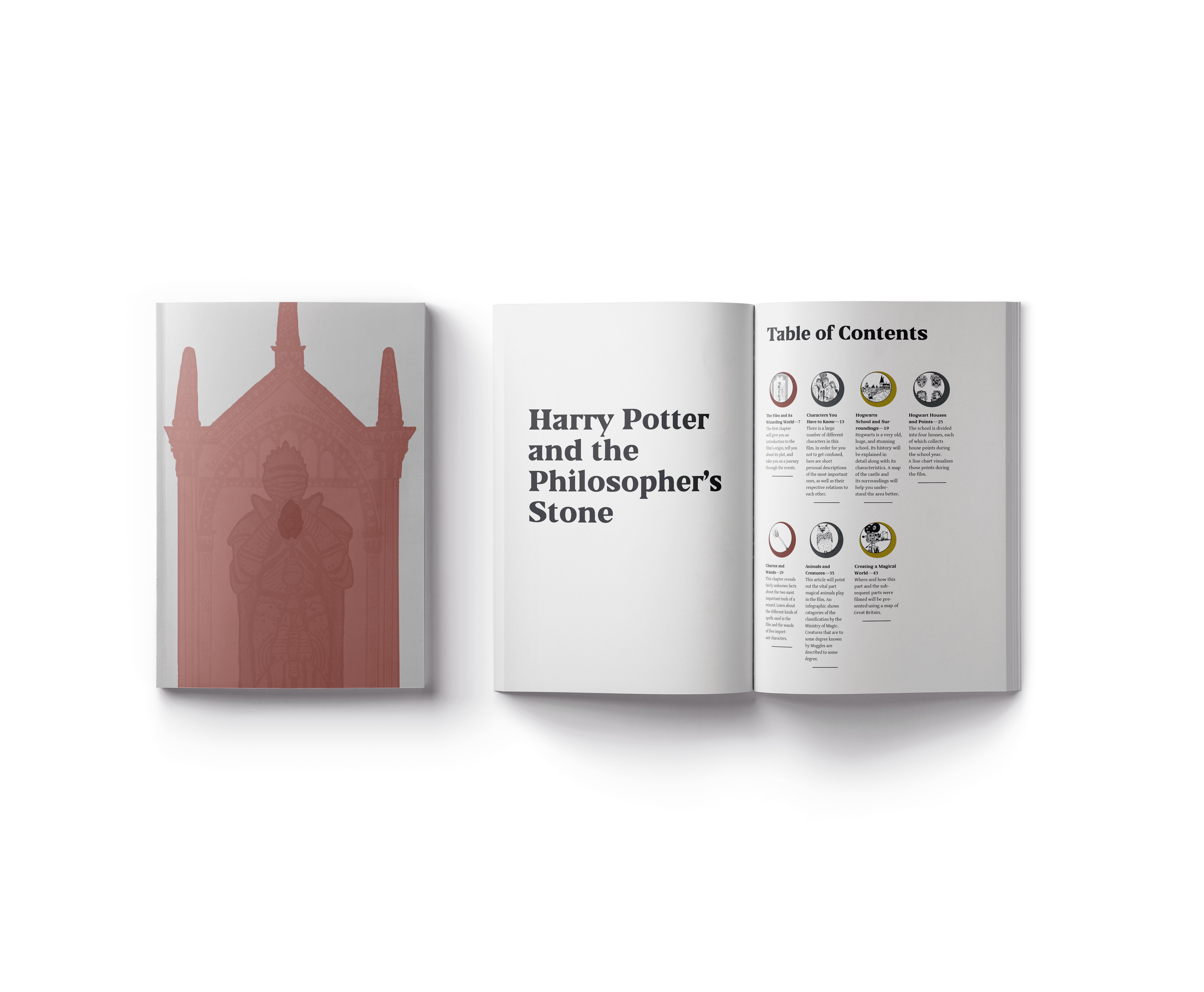 Für eine Filmanalyse wählte ich den ersten Teil der bekannten Harry Potter Filmreihe. Im Laufe der Arbeit erkannte ich meine große Liebe für Infografiken, welche sich auch am Umfang des Magazins wiederspiegelt. Dieses spiegelt den Film wieder, und verschafft zusätzlich einen Einblick in die Komplexität von Harry Potter. Diverse Visualisierungen zu Zauberstäben und -sprüchen, der umfangreichen Kreaturenwelt, sowie auch den Hogwarts Häusern und deren Hauspunkten nehmen die LeserInnen in diese wunderbare Welt voller Zauber mit.